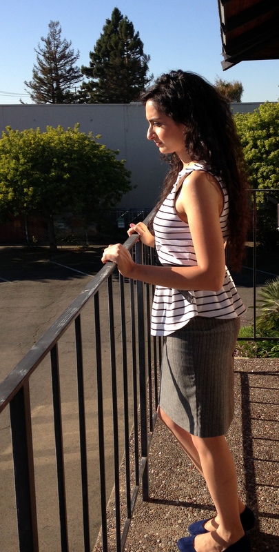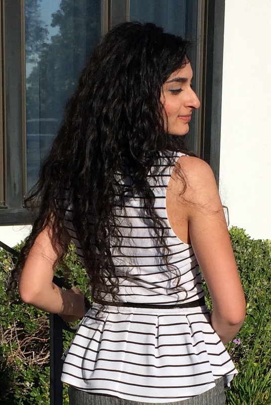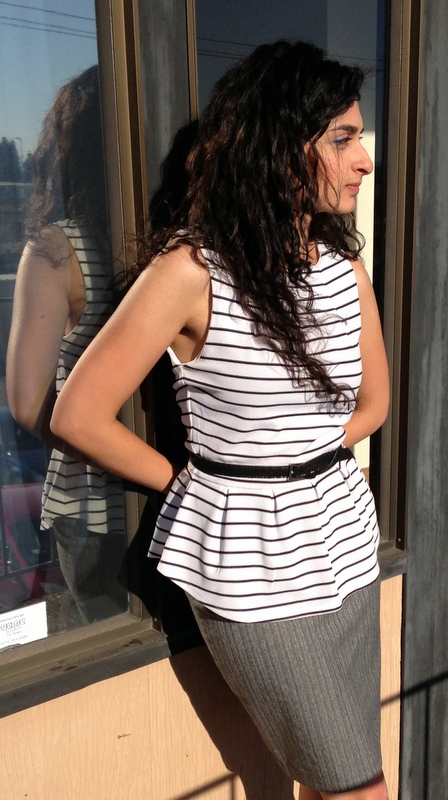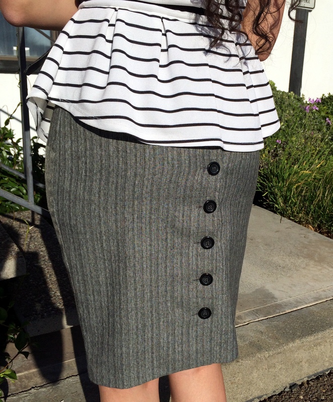 We can’t get enough of this look! From the striped peplum to the button up pencil skirt, it was super easy to put a fun spin on one of our favorite fashion pieces. We simply twisted the skirt around to instantly create a very unique show stopper and re-purposed the belt that came with the skirt to accentuate the waist.
